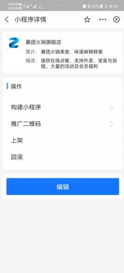 - 点击【推广二维码】获取小程序二维码图片,点击按钮【上架】,上架小程序,点击按钮【下架】下架小程序;点击按钮【回滚】将小程序版本回滚到上一个发布的版本;