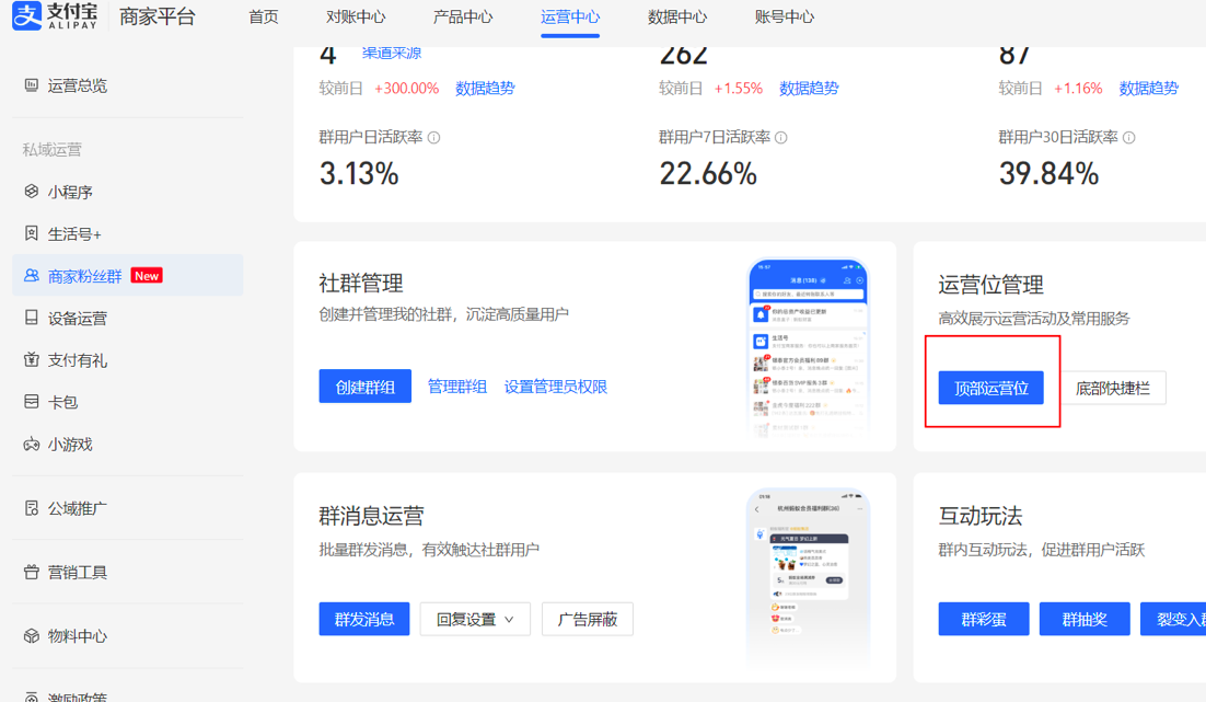 - ①找到配置入口:运营中心-商家粉丝群-运营位管理-顶部运营位