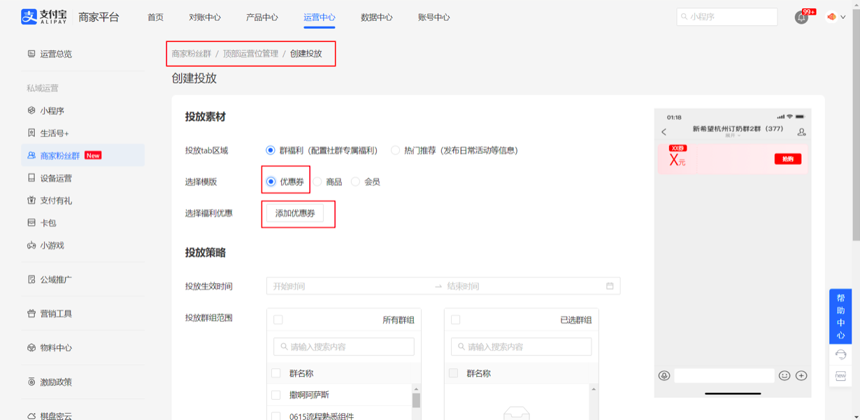 - 投放群组范围:可选择账号下全部群组,或某一指定群组
