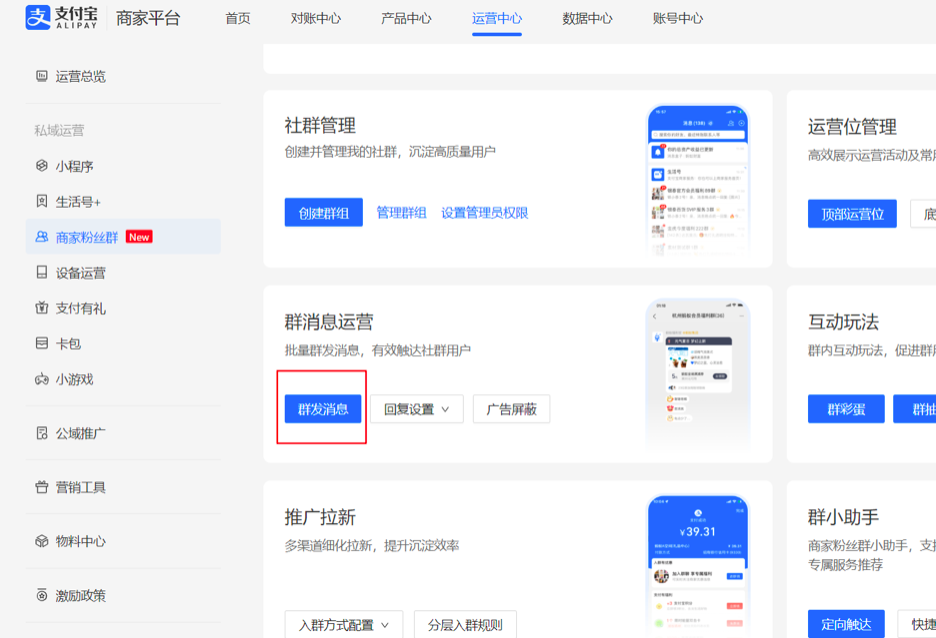 - ①找到配置入口:运营中心-商家粉丝群-群消息运营-群发消息