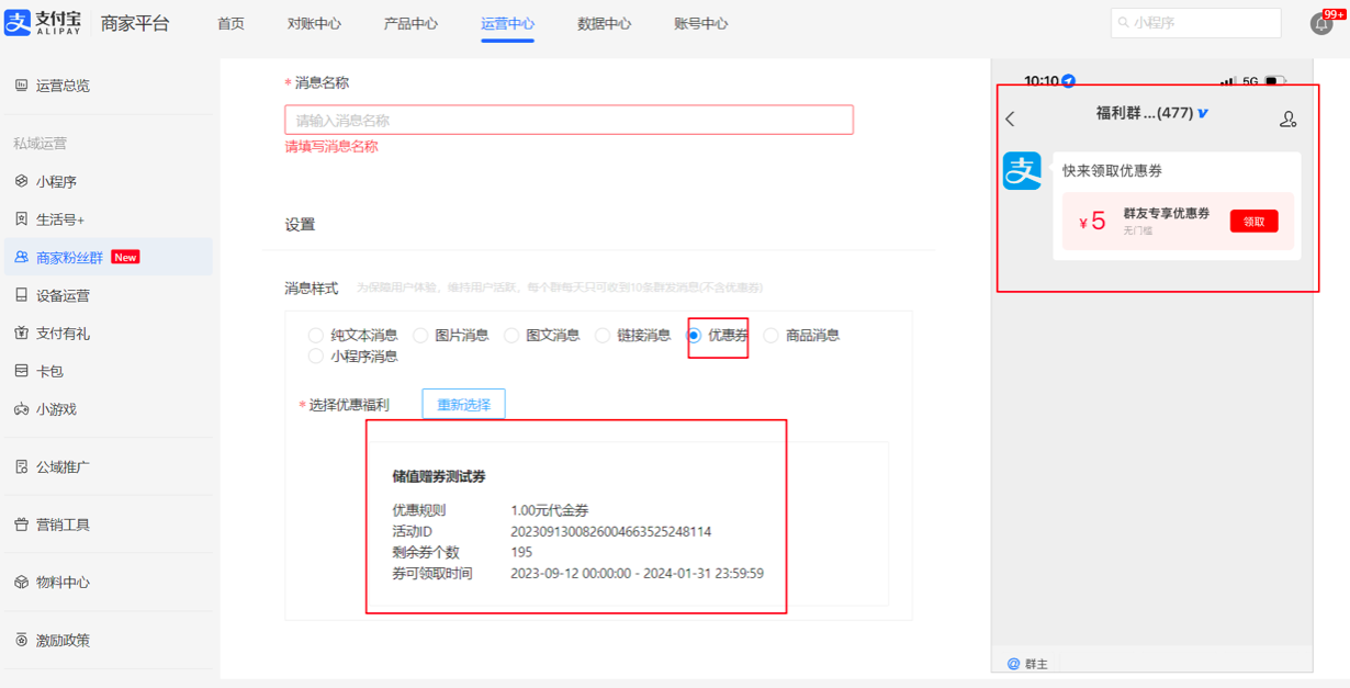 - ②配置群发消息“优惠券”模板:配置项选择优惠福利,此处可选择群运营同一账号PID下已创建优惠券