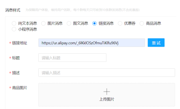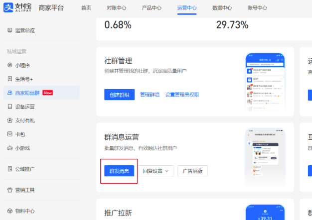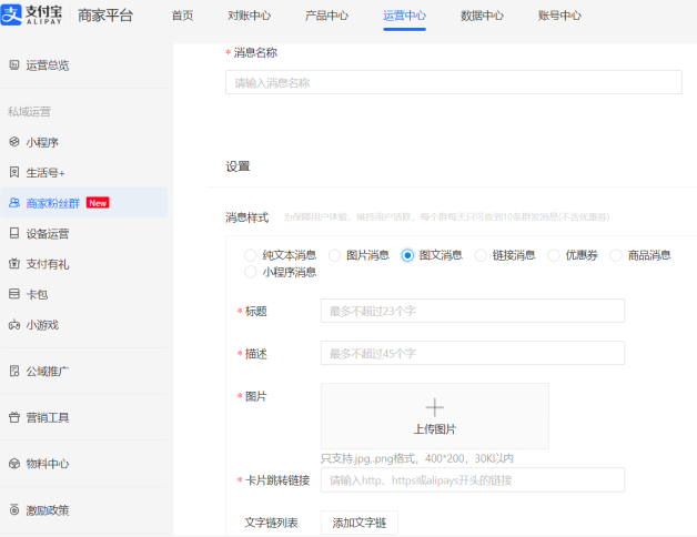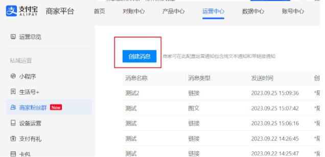 - ①找到配置入口:登录支付宝商家平台-运营中心-商家粉丝群-群消息运营-群发消息-创建消息