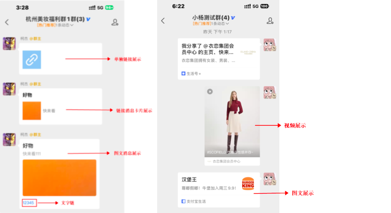1.图文/视频互动玩法- 商家可以将已制作好的生活号图文/视频内容分享群发至群内,与群用户形成良性互动,增强内容辐射效率: