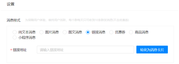 - ②配置群发消息:可选择图文消息样式和链接消息样式(推荐图文消息样式,图片展示更大吸引用户点击)