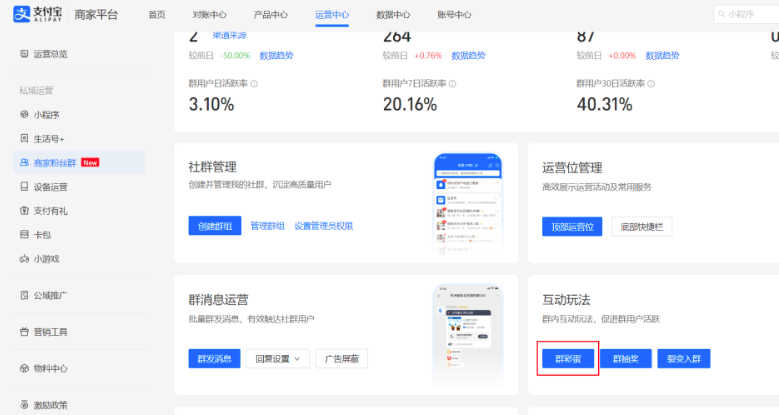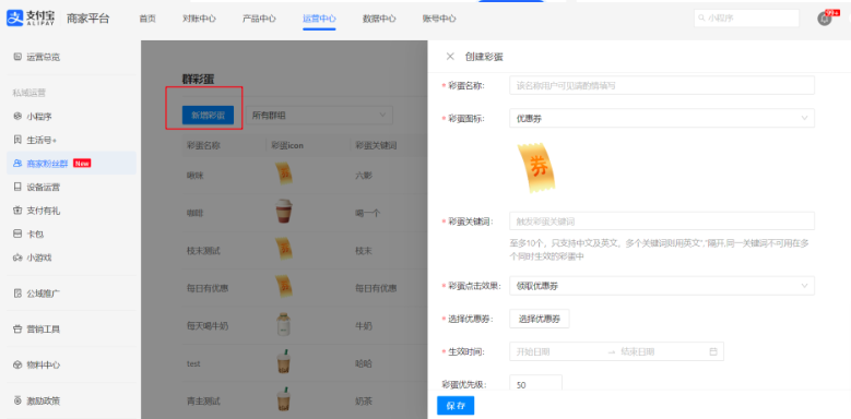- 路径:登录支付宝商家平台-运营中心-商家粉丝群-互动玩法模块,点击“群彩蛋”-点击“新增彩蛋”,配置相关内容信息