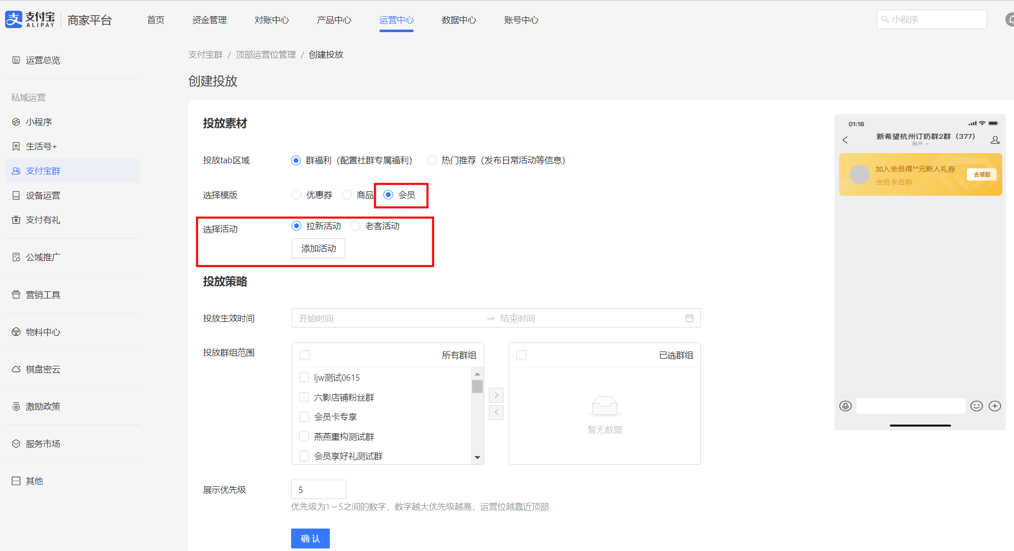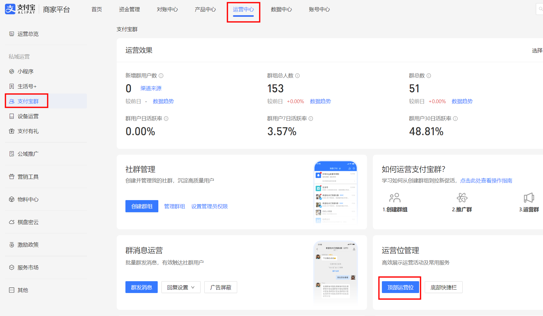 - 菜单路径:登入支付宝商家平台-运营中心-支付宝群-运营位管理-顶部运营位-创建投放,去配置
