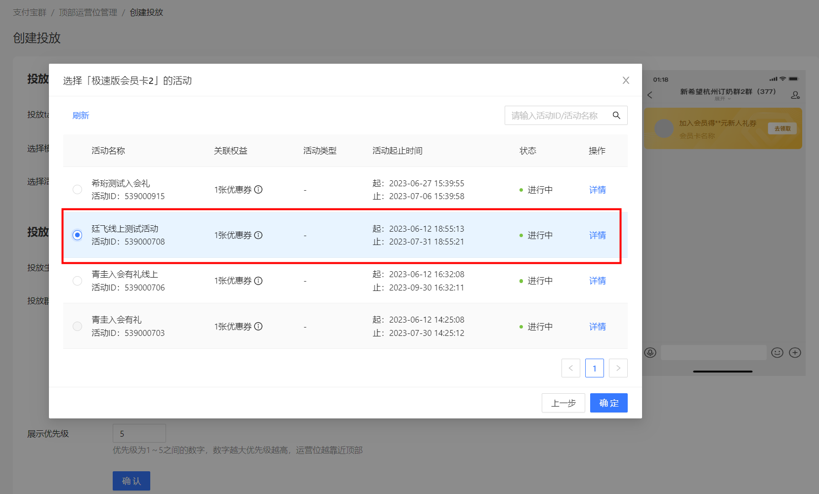 - 点击“拉新活动”,选择“添加活动”,选择希望在指定群组内投放的会员卡,点击下一步