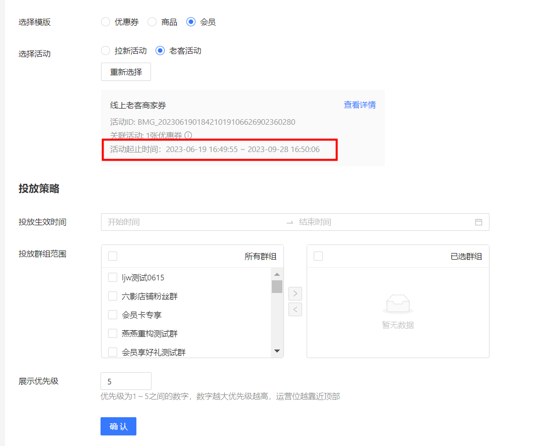 - 投放群组范围:选择需要投放老客活动的群组范围