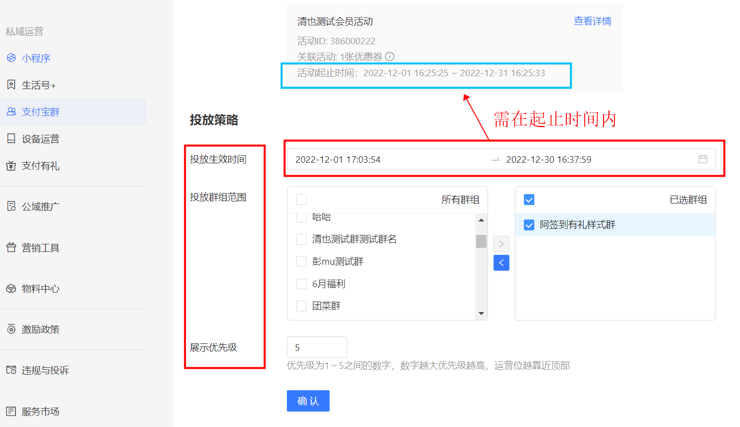 - 投放生效时间:需在入会有礼活动起止时间内(即投放开始时间晚于入会有礼活动开始时间,结束时间早于入会有礼活动结束时间)