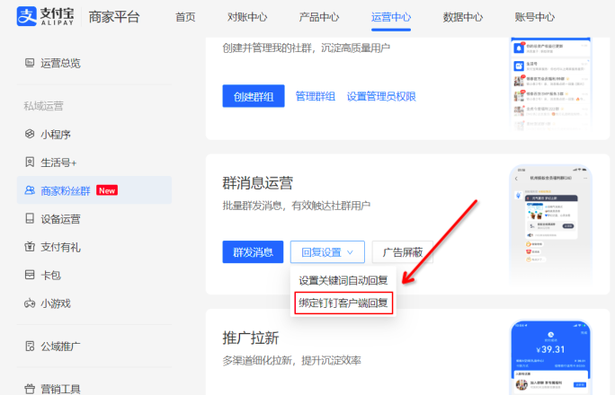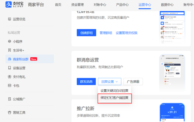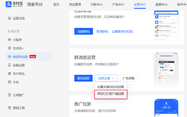 - 路径:商家粉丝群-群消息运营-回复设置-绑定钉钉客户端回复