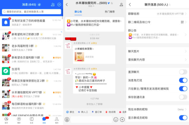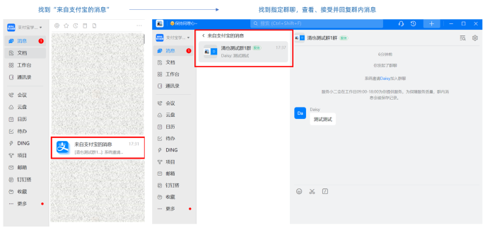 1.移动端管理:支付宝APP移动端接收&回复消息- 群主或群管理员可以通过移动端消息tab---找到自己负责的群,查看群内发言及回复用户消息