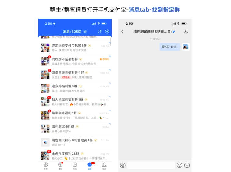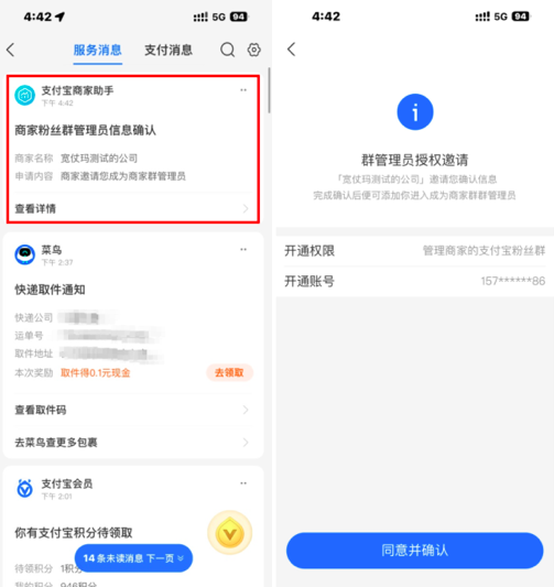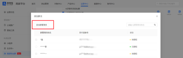 - 添加群主/群管理员, 需要商家在「管理群组-管理群主」中添加员工姓名、支付宝账号,授权通知将会发送至员工「支付宝APP-最新消息」中授权同意后方可添加成功