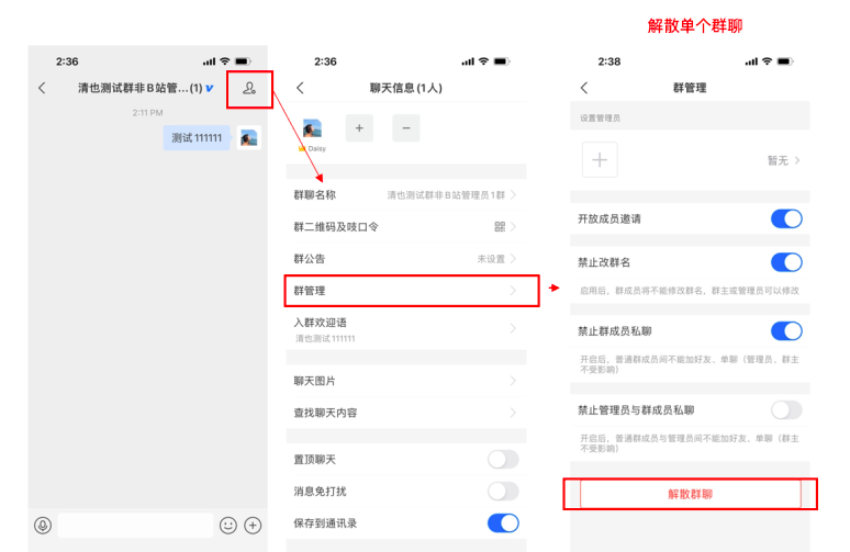 - 目前支持手动解散单个群聊,不支持批量解散群聊或群组,操作路径如下: