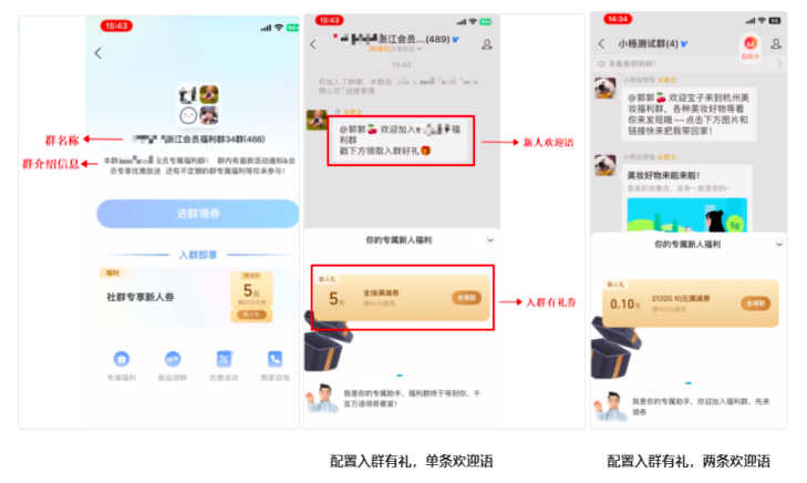 - 新人欢迎语支持简短文字+图片+链接整体发送。商家可选择图文消息或小程序消息进行配置