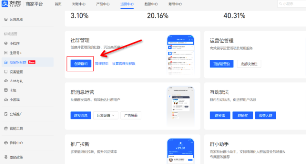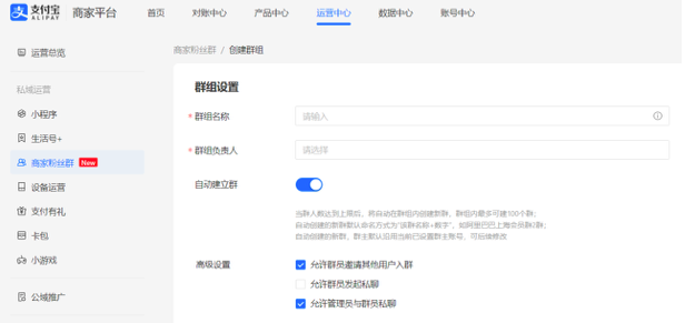 - 路径:群超级管理员登录支付宝商家平台-运营中心-商家粉丝群-点击“创建群组”