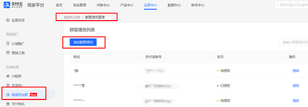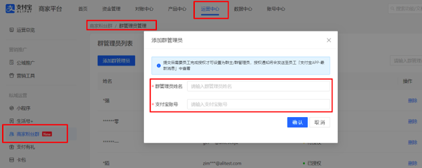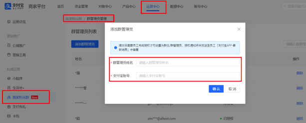 - 路径:商家粉丝群->管理群组->管理群主->添加群管理员->填写员工姓名、支付宝账号