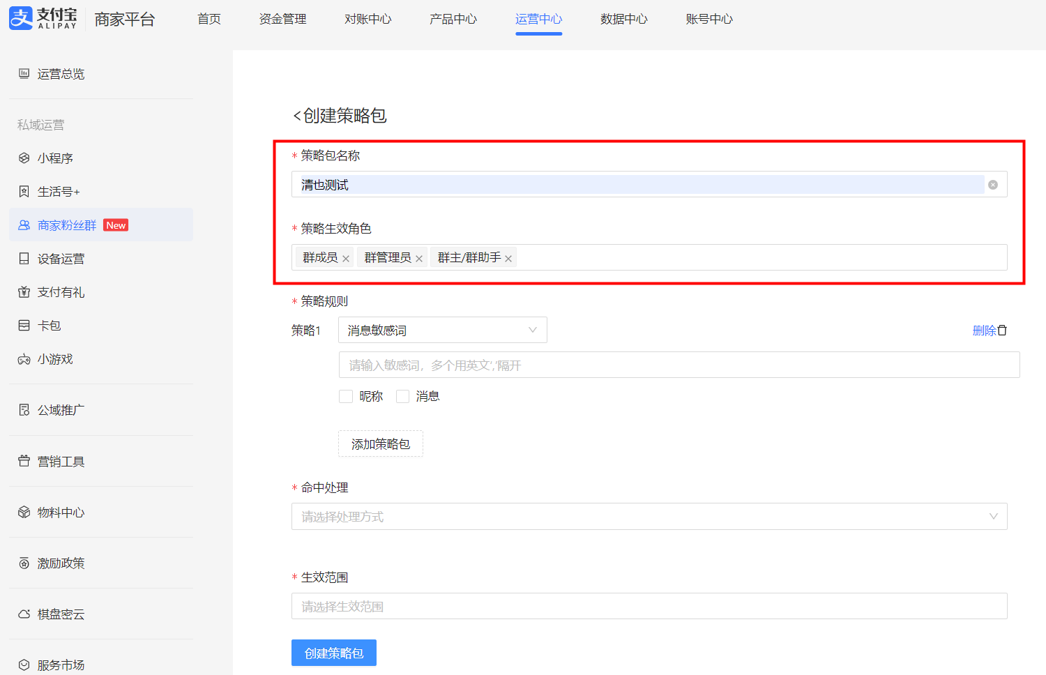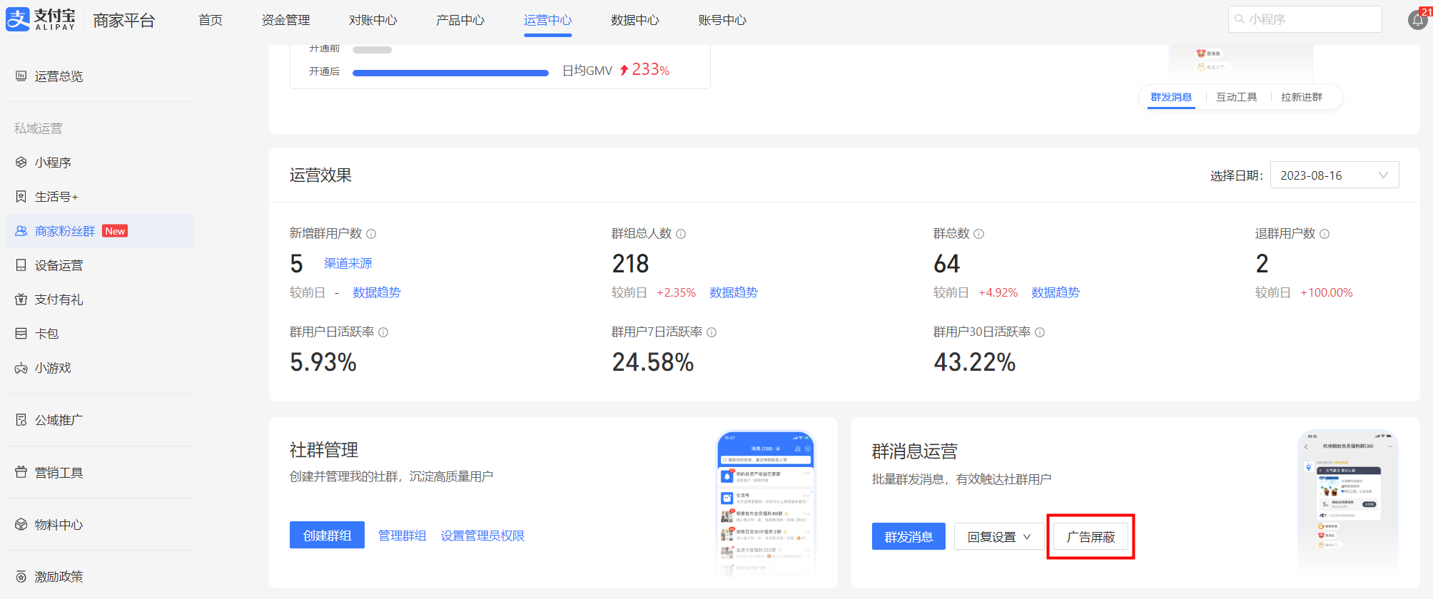 - 路径:登录支付宝商家平台---运营中心---商家粉丝群---群消息运营---广告屏蔽