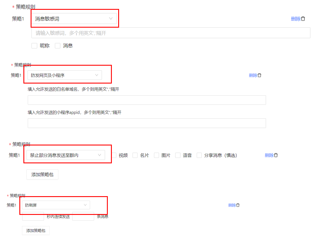 - 防发网页及小程序:设置白名单网址或白名单小程序appid后,用户在群内发其他网址信息/小程序信息,将受到屏蔽处理
