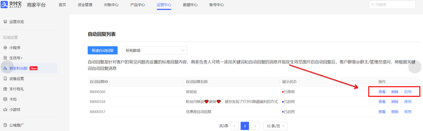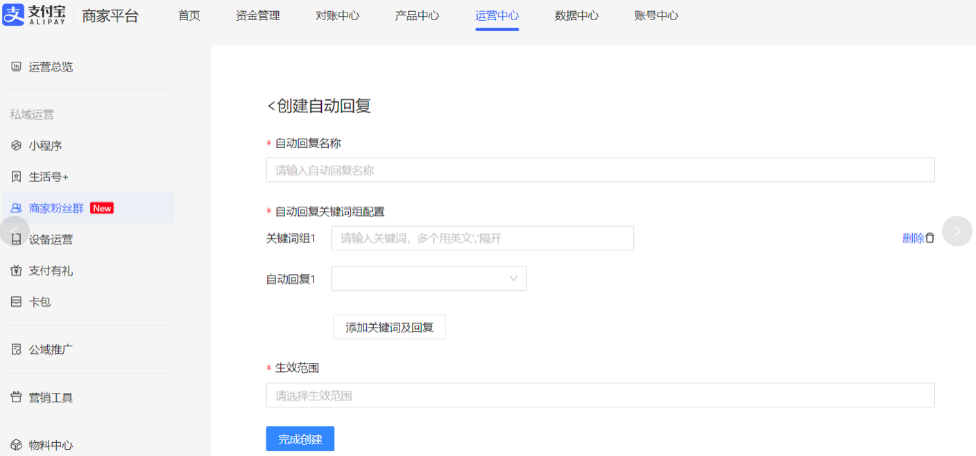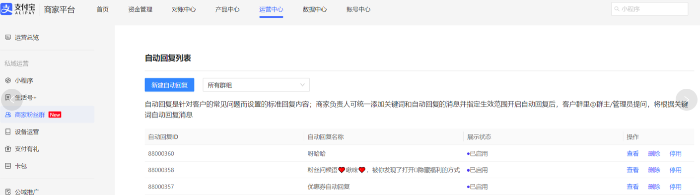 - 路径:登录支付宝商家平台 ---运营中心---商家粉丝群---群消息运营---回复设置---设置关键词自动回复