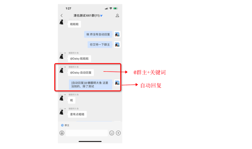 - 关键词:用户在群内发消息@群主 +关键词,触发下面的自动回复(比如折扣、优惠、服务、客服等等关键词)