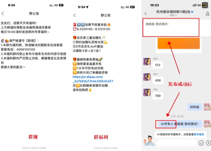 - 群公告发布成功后,系统自动@全体成员,提醒用户及时查看信息