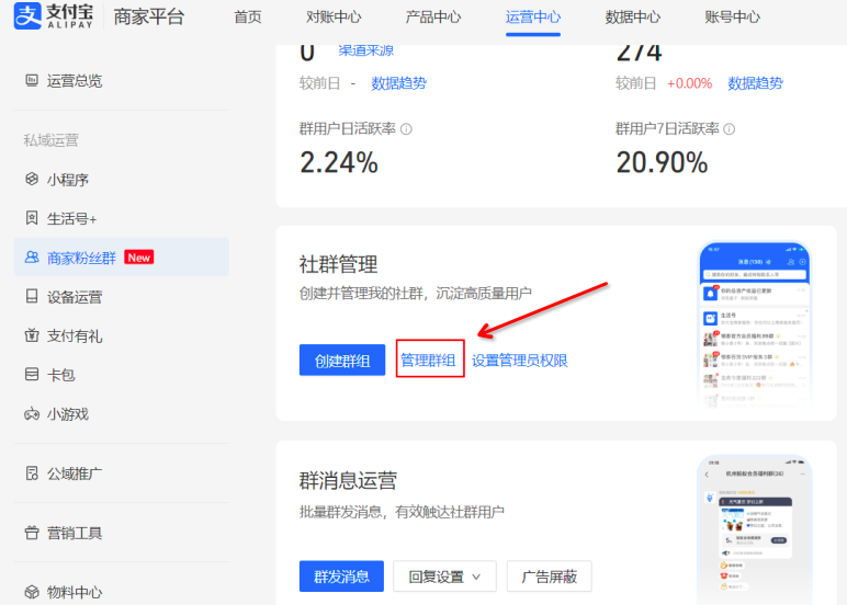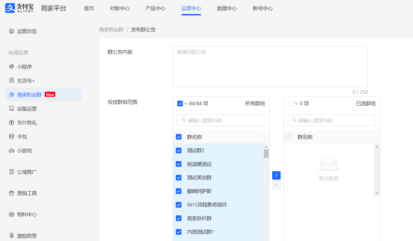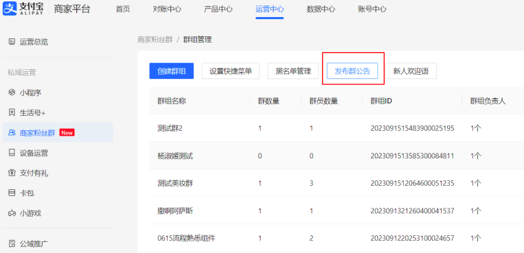 - 路径:登录支付宝商家平台---运营中心---商家粉丝群---管理群组---点击“发布群公告”