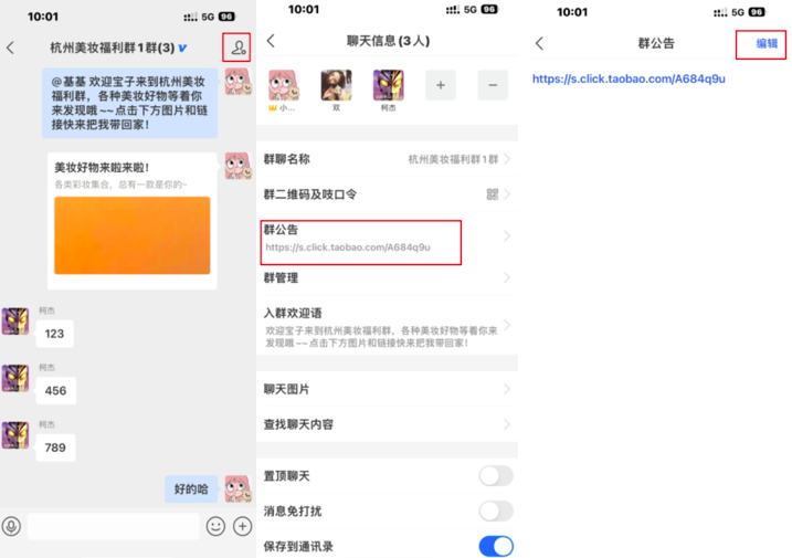 - 群福利,群活动预热公告,及小程序商品页面链接引导用户点击