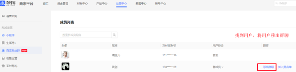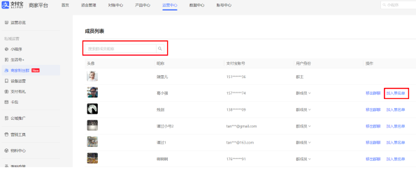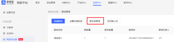 - 路径:登录支付宝商家平台---运营中心---商家粉丝群---管理群组---黑名单管理